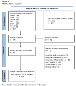 After duplicates were removed, the initial search resulted in635 individual studies. The first selection on title and abstract resulted in 87 individual studies that were full-text screened based on the inclusion criteria. Finally, 30 studies met all the inclusion criteria (seeFigure 1). The selection process was conducted by two different authors, who selected the studies independently of each other. To resolve selection conflicts, a third author was involved in the final decision making. An overview of the included studies and their main characteristics can be found inTable 1. Additional data for each study can be found in the online supplemental materials.