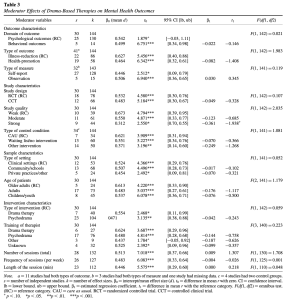 Contrary to our expectations, none of the moderating variables significantly influenced the effects of drama-based therapies on mental health outcomes. However, some noteworthy differences in effect sizes were found in our moderator analyses that did not reach the conventional level of significance. We also noted some moderators with little or no difference in individual categories that deserve to be high-lighted since they have implications or future research.